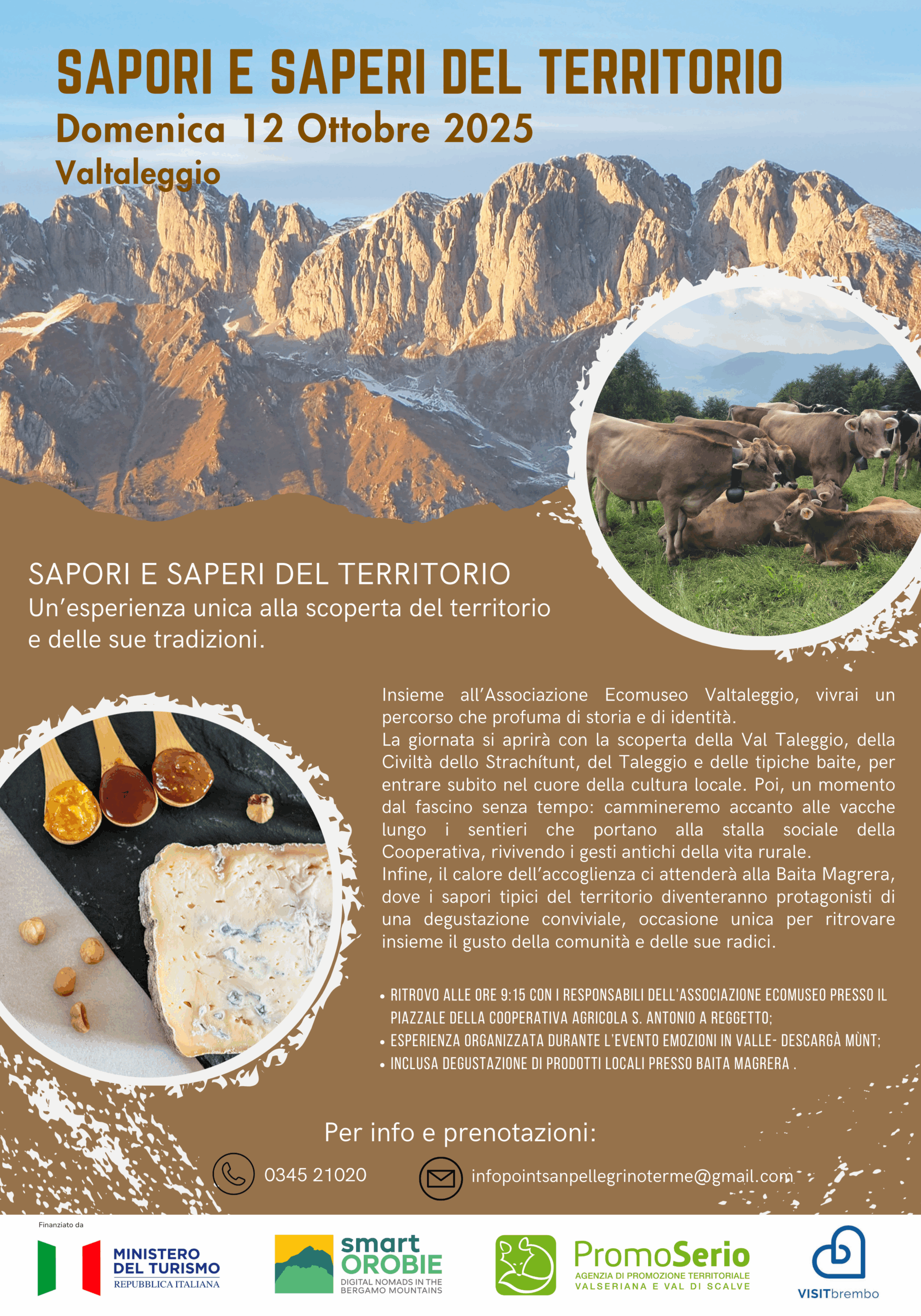 Insieme all’Associazione Ecomuseo Valtaleggio, vivrai un percorso che profuma di storia e di identità. La giornata si aprirà con la scoperta della Val Taleggio, della Civiltà dello Strachítunt, del Taleggio e delle tipiche baite, per entrare subito nel cuore della cultura locale.